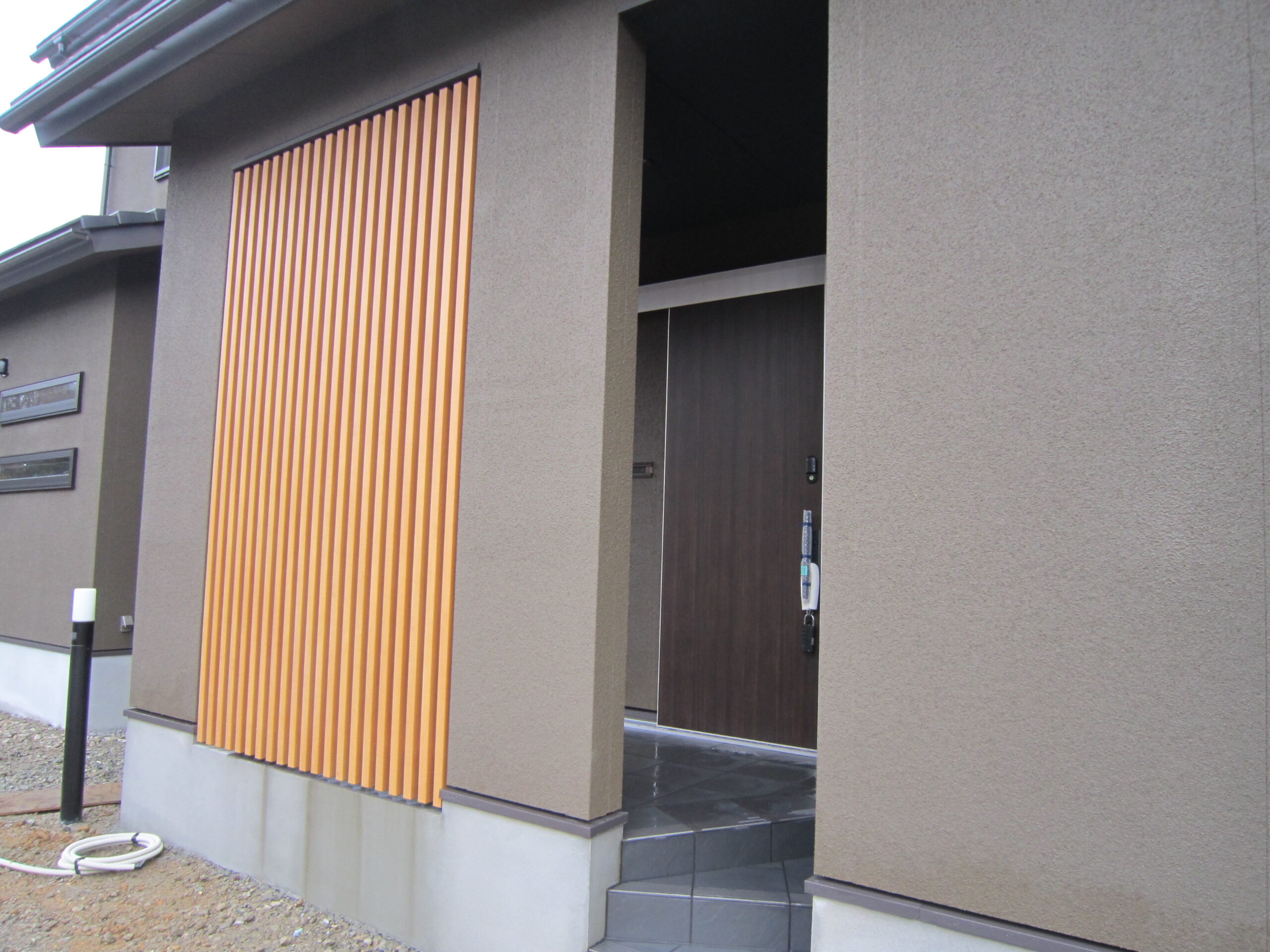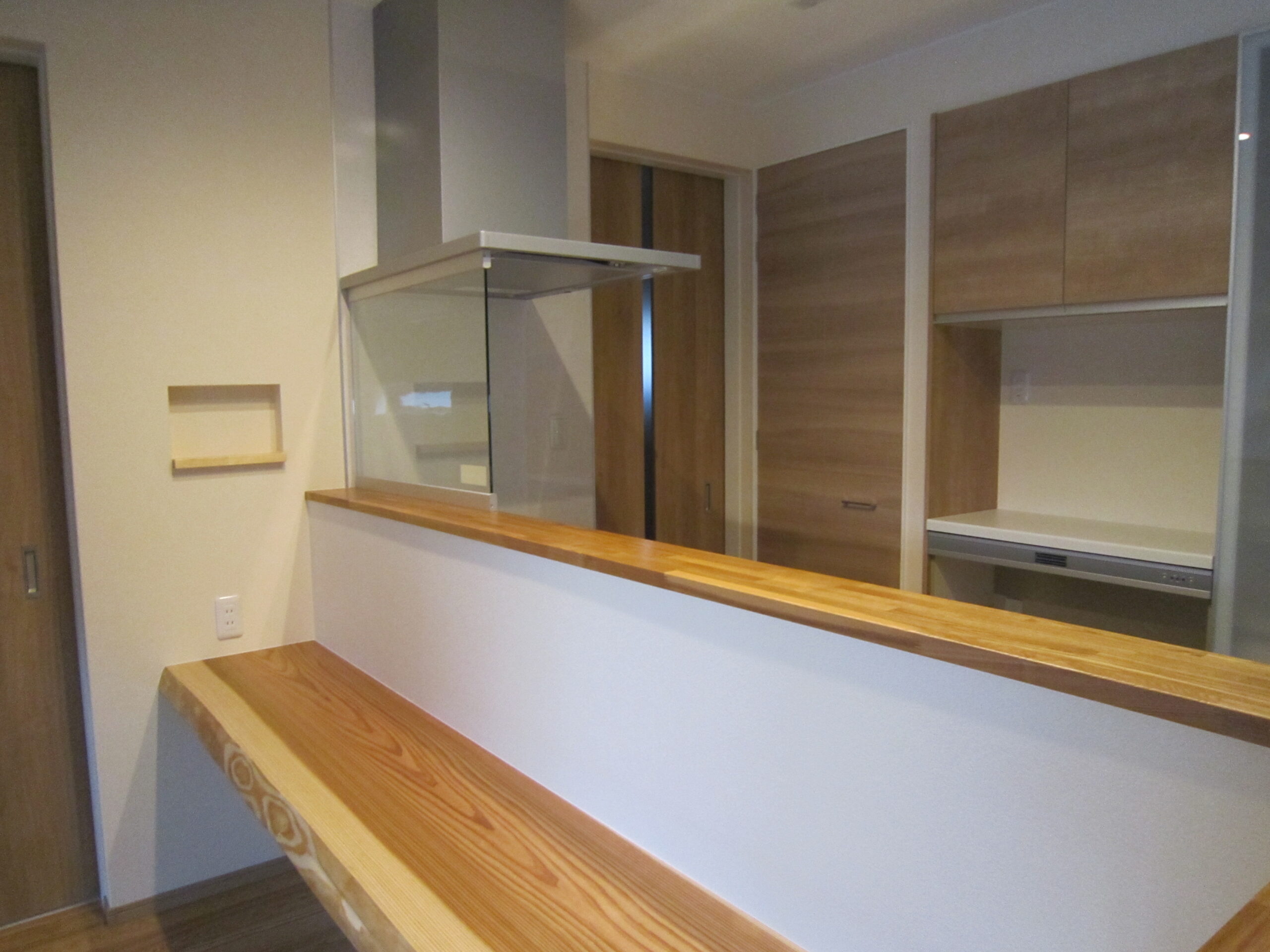 無垢一枚板を玄関腰かけ・キッチン前カウンター・トイレ手洗いに使うなど和の要素も取り入れた和モダン住宅です。