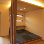 玄関ホール・LDK・畳コーナーの随所に設えた間接照明。TVボードやカップボードは無垢突板を使い造作で仕上げました。